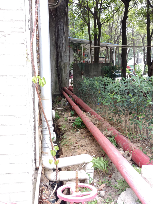 技术部陈工利用消防水管来做短距离的声波数据通信测试。